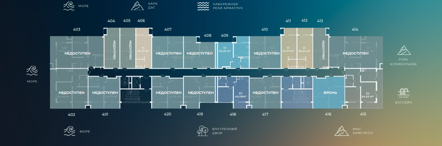 Каждое планировочное решение располагает собственной террасой с великолепным видом на море и горы, обеспечивая идеальные условия для наслаждения утренним кофе или вечерними закатами.