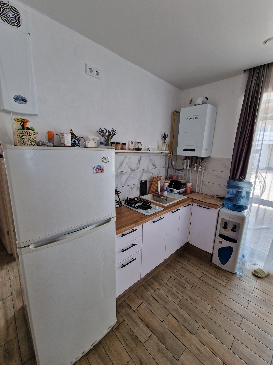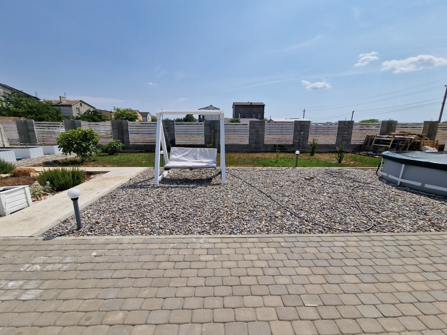 Земельный участок 8 соток. Высажены плодовые деревья: яблоки, персики, груши, черешня, инжир и др., цветы, виноградник. Проведен автополив зеленых насаждений и освещение в темное время суток. Во дворе есть место для авто.