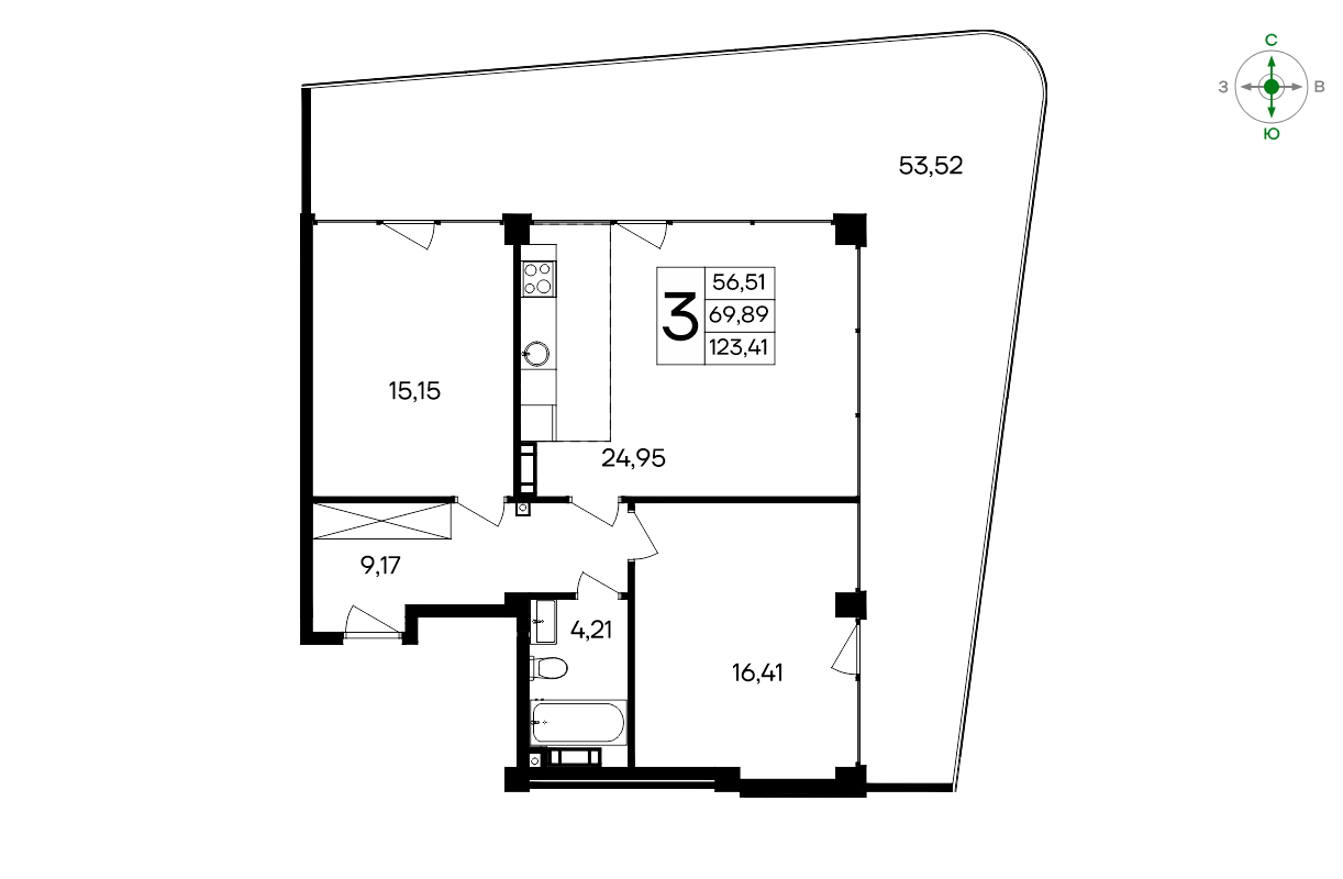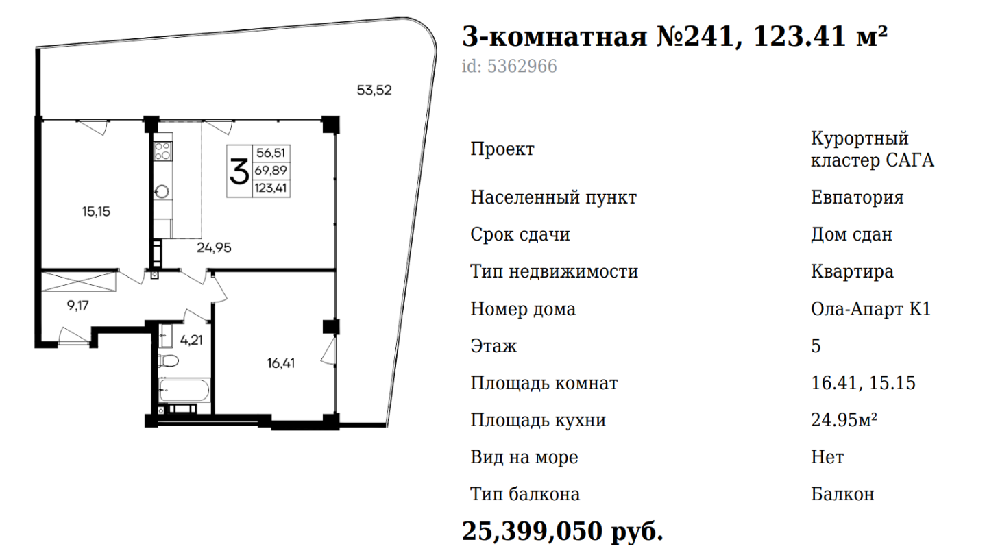 Количество комнат3-к квартираЭтаж5Площадь123.41Жилая площадь31.56Площадь кухни24.95Площадь комнат15.15+16.41Балкон1Совмещенных санузлов1ОкнаДвор + улицаРемонтОтсутствует