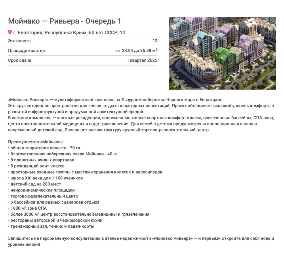 У магических берегов мойнакского озера, посреди тысячелетнего города Евпатории, под плеск черноморских волн и дыхание степных трав, расположен комплекс Moinaco Riviera.Ссылка на объявление: https://status-realty-evpatoria.ru/sale/saleapartments/177601